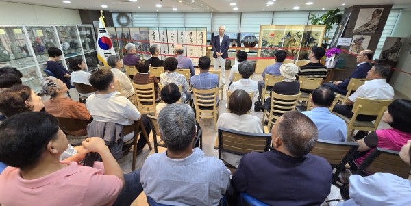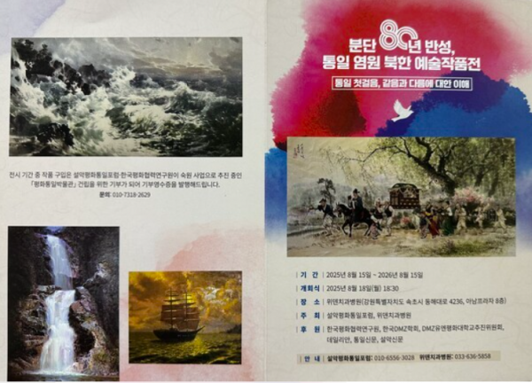 한국평화협력연구원 산하 설악평화통일포럼과 위덴치과병원이 공동으로 통일염원 고취를 위해 북한 예술작품전을 1년(2025.8.15~2026.8.15) 간 진행하고 있습니다. 8월 18일(월) 18:30 위덴치과병원 내 전시공간에서 관계자 및 방문객 50여 명과 함께 개회식을 가졌습니다.