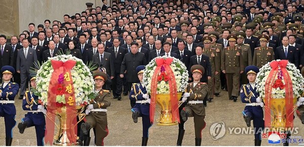 <사진> 김정은 북한 국무위원장이 김정일 국방위원장 사망 12주기를 맞아 지난 16일 금수산태양궁전을 참배했다고 조선중앙통신이 17일 보도했다. [사진=연합뉴스]