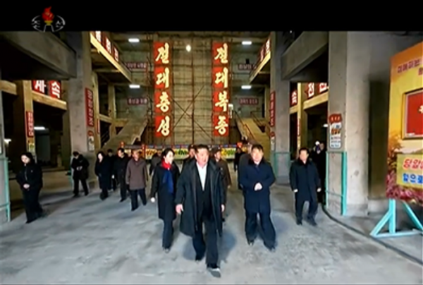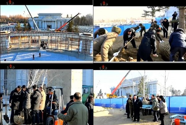 지난해 10월 23일 ‘해외 군사작전 전투위훈기념관건설착공식’을 ‘숭엄히’ 거행한 김정은, 지난 1월 5일 현장을 찾아 점검에 나섰다. 빨간 목도리로 확 눈에 들어오게 한 껌딱지 김주애와 당·정 주요 간부들과 함께다.